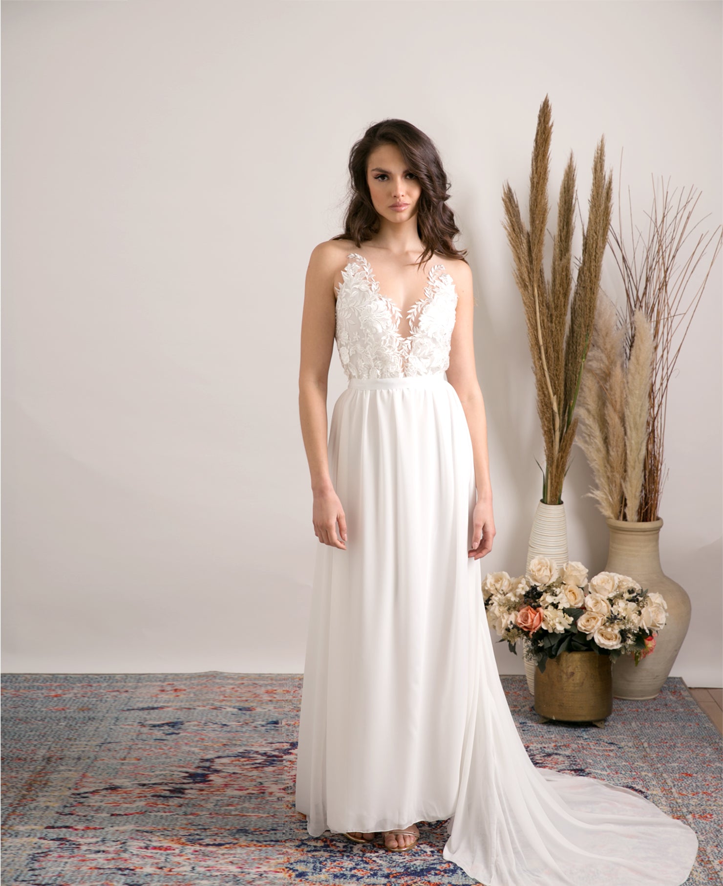 קים היא שמלת כלה קסומה ובילתי נשכחת, עם צללית חלומית ועוצרת נשימה, טופ תחרה מרחף עבודת יד וחצאית קלילה ועשירה בבד.